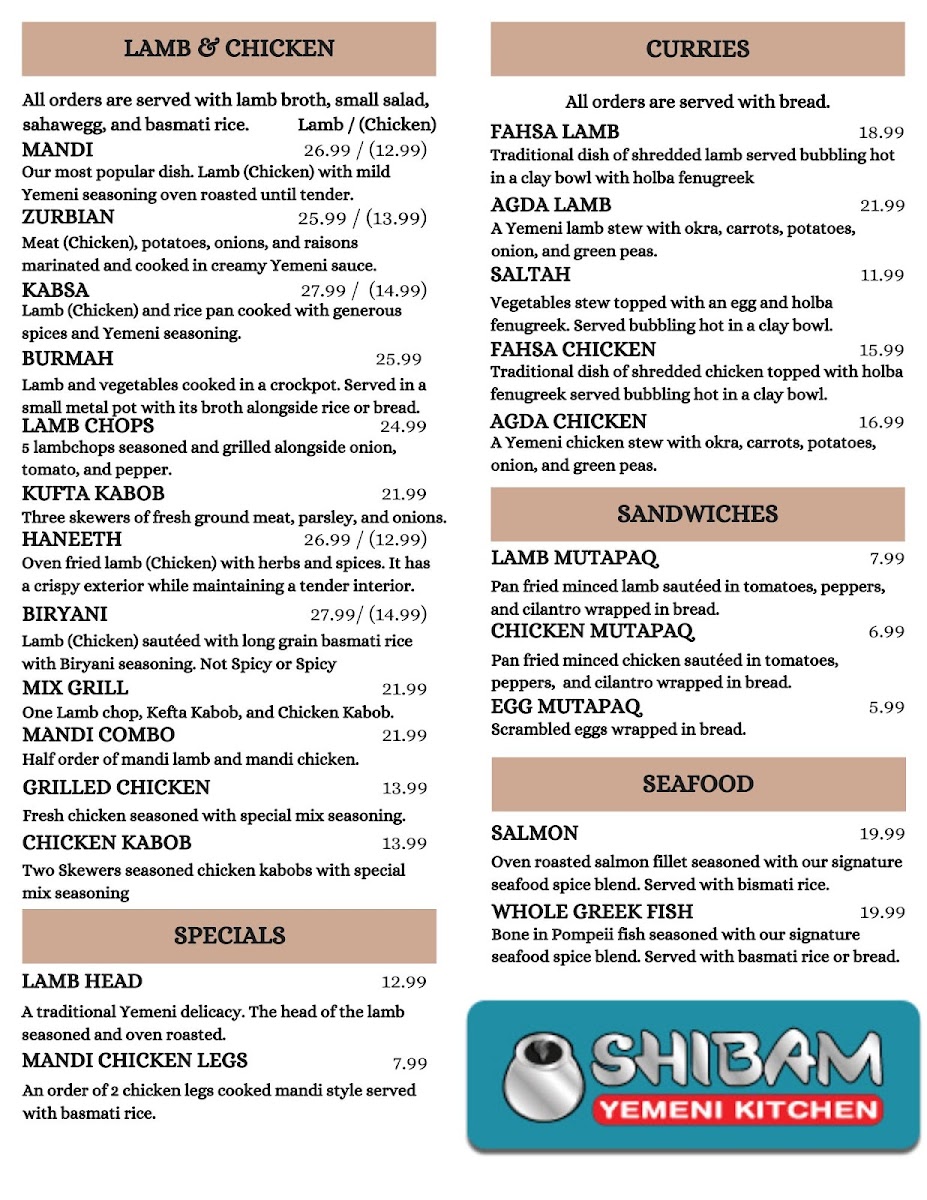 Welcome to Shibam Restaurant, a hidden gem specializing in authentic Yemeni cuisine. Located in a charming yet unassuming setting, our restaurant may not boast modern décor, but it delivers a delightful culinary experience. Guests rave about our tender lamb dishes, particularly the Lamb Haneeth and Lamb Mandi, showcasing rich flavors and traditional spices. The warm hospitality and attentive service create a welcoming atmosphere for families and friends alike. Whether you're savoring our popular pistachio Frappuccino or the flavorsome Haleem, every dish promises to delight your palate. Come discover the vibrant tastes of Yemen at Shibam Restaurant!